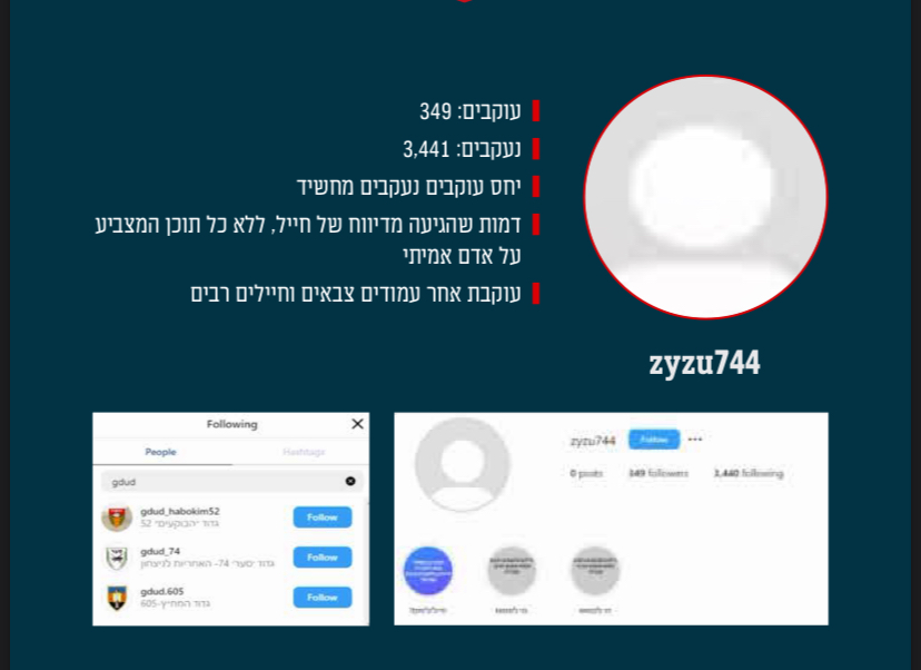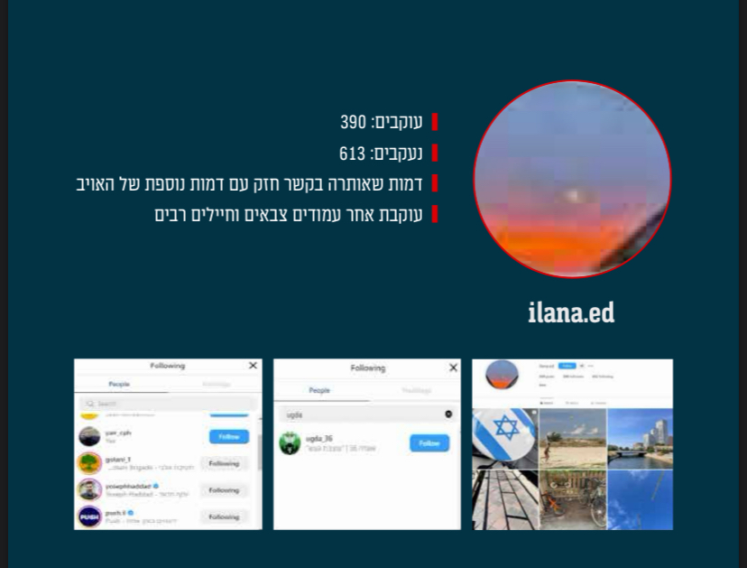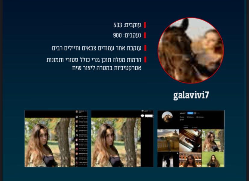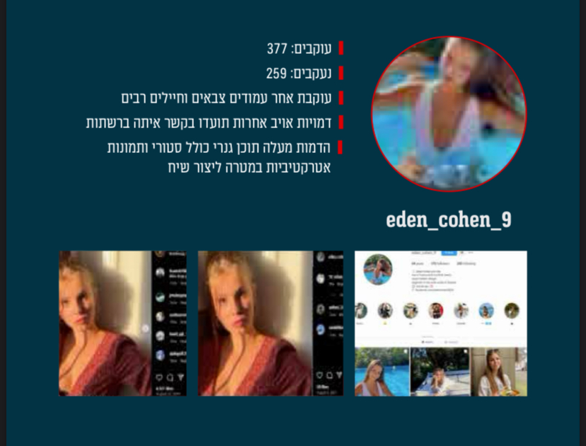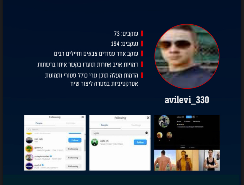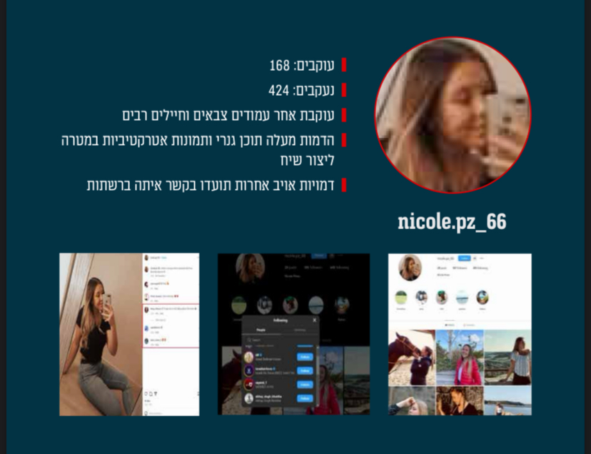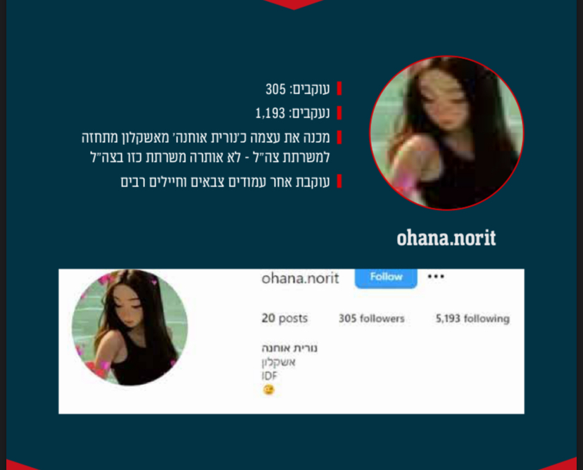 מעקב אחר חיילים ברשתות החברתיות הינה אחת משיטות האויב להעשרת המודיעין. משרתי צה״ל וכלל הציבור מתבקשים לגלות עירנות מירבית בנושא ולהמשיך לדווח לגורמי המקצוע השונים על דמויות חשודות שמופיעות ברשתות הדיגיטל השונות ולנקוט בצעדי הגנה על הפרטיות ברשת. רשימת הפרופילים הפיקטיביים - בדקו שאינם בין העוקבים שלכם באינסטגרם וחיסמו אותם מיד: