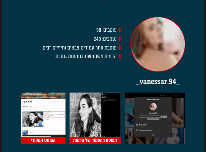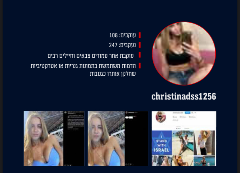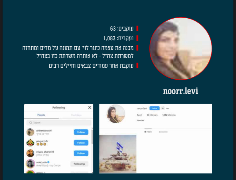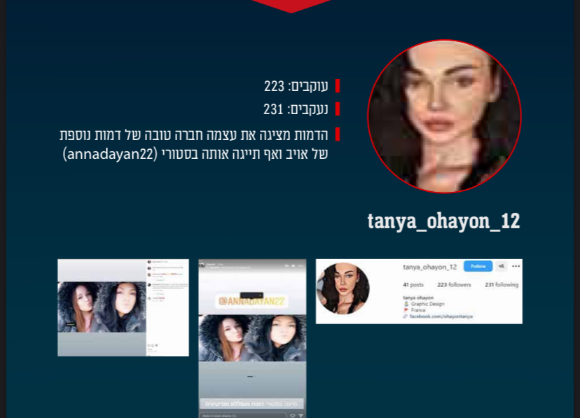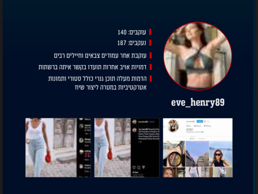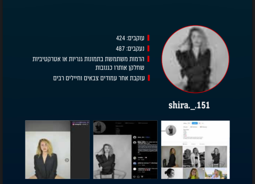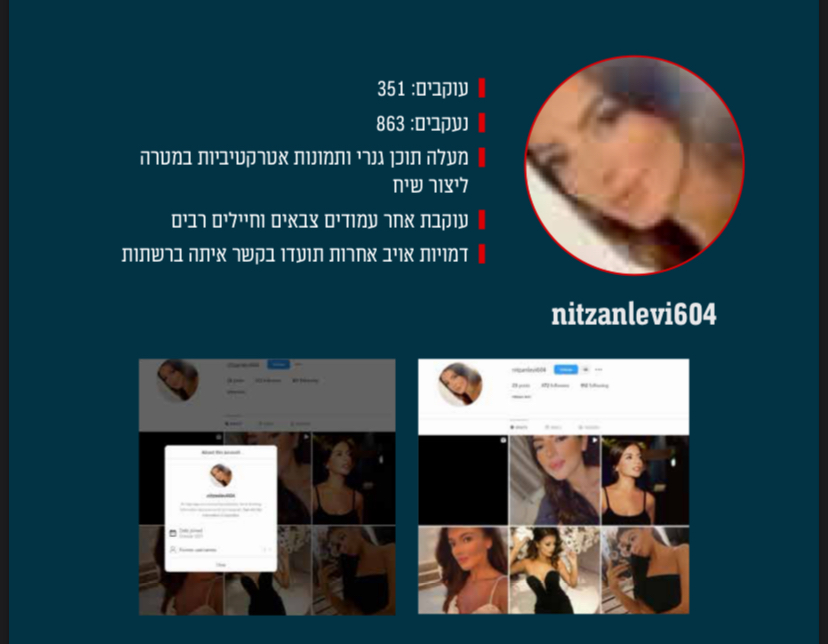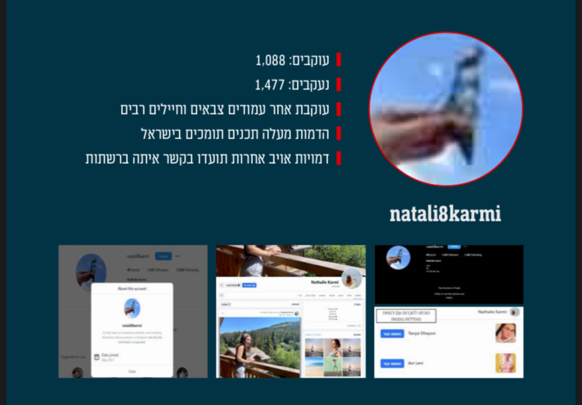 מעקב אחר חיילים ברשתות החברתיות הינה אחת משיטות האויב להעשרת המודיעין. משרתי צה״ל וכלל הציבור מתבקשים לגלות עירנות מירבית בנושא ולהמשיך לדווח לגורמי המקצוע השונים על דמויות חשודות שמופיעות ברשתות הדיגיטל השונות ולנקוט בצעדי הגנה על הפרטיות ברשת. רשימת הפרופילים הפיקטיביים - בדקו שאינם בין העוקבים שלכם באינסטגרם וחיסמו אותם מיד: