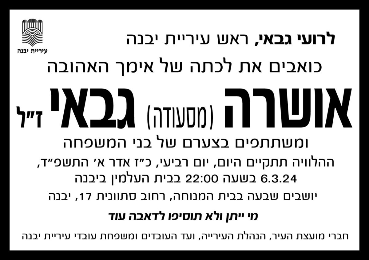 ראש העיר, רועי גבאי, אחיו ובני המשפחה הודיעו הערב בכאב רב על פטירתה. הלווייתה תתקיים הערב בשעה 22:00 בבית העלמין ביבנה. תהא נשמתה צרורה בצרור החיים. השבעה תתקיים בבית המשפחה שברחוב הסתוונית 17 ביבנה.
