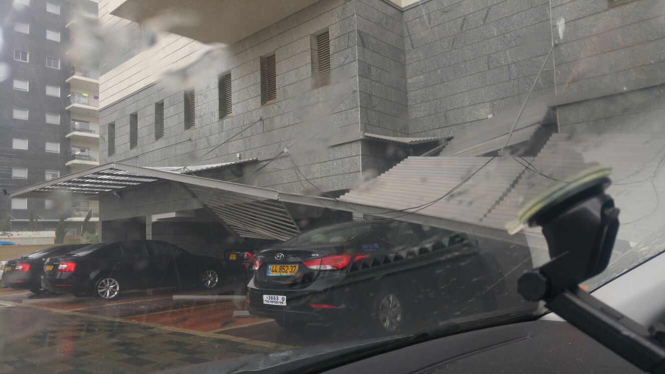 עץ קרס בכיכר לב יבנה, גגון לחנייה התרסק על רכב בירוקה