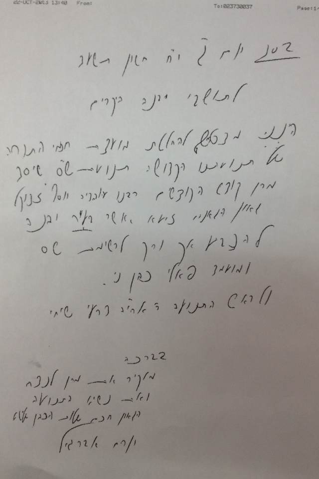 המכתב בכתב ידו של כבוד הרב יורם אברג'יל: