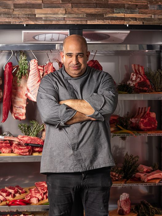 שף גיא פרץ על רקע וטרינת הבשרים בפתח המסעדה