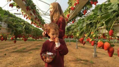 תות השדה ( דצמבר-מאי) גדל בגבהים שונים (מקנה נוחות\מקל בקטיף לילדים ומבוגרים) בחממה מוגנת מגשם.