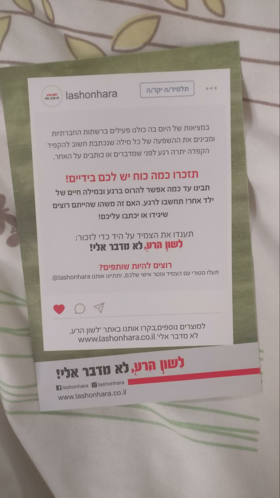 אתמול (שני) התקיימה במליאת הפרלמנט העירוני פעילות מיוחדת שנשאה את הכותרת "לשון הרע - לא מדבר אליי!".