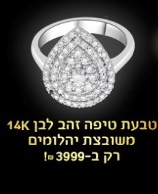 מחירה של טבעת הזהב משובצת היהלומים בדמות טיפה גדולה המוצגת במודעה הינו 3,999 שקלים, ולא 150 שקלים, כפי שפורסם.