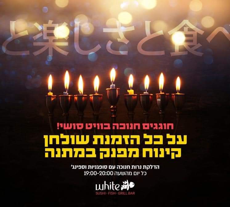 וויט סושי מזמינים אתכם לחגוג איתנו את חג החנוכה בכל ערב, בהם תתקיים הדלקת נרות חגיגית במסעדה ושלל פעילויות