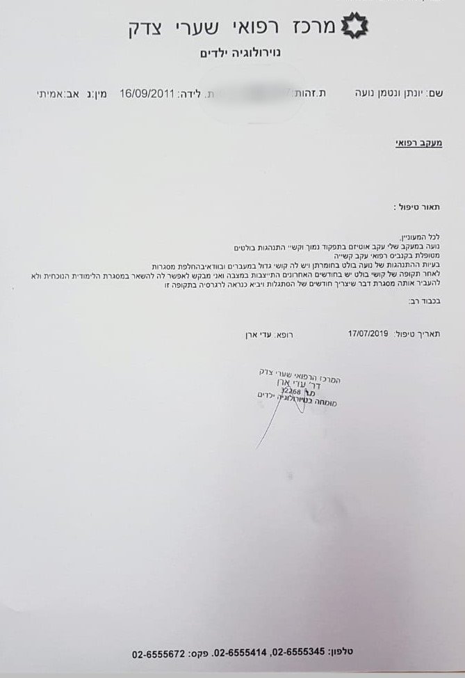 היא מציינת עוד: "בעלי ניגש למינהל החינוך ואמר להם שאנחנו מבקשים בגלל המצב שלה להשאיר אותה בבית הספר הנוכחי. אנחנו לא רוצים לטלטל אותה, כל מעבר כזה יכול לגרום לרגרסיה". עוד הוסיפה כי הילדה מתפקדת כיום, בגיל 8, כמו בת שנתיים ("ביום טוב"), וכי בית הספר בראשון-לציון הצליח לקדמה ולהביאה להישגים.