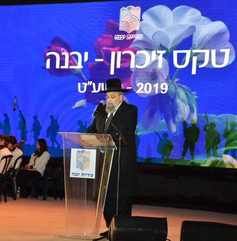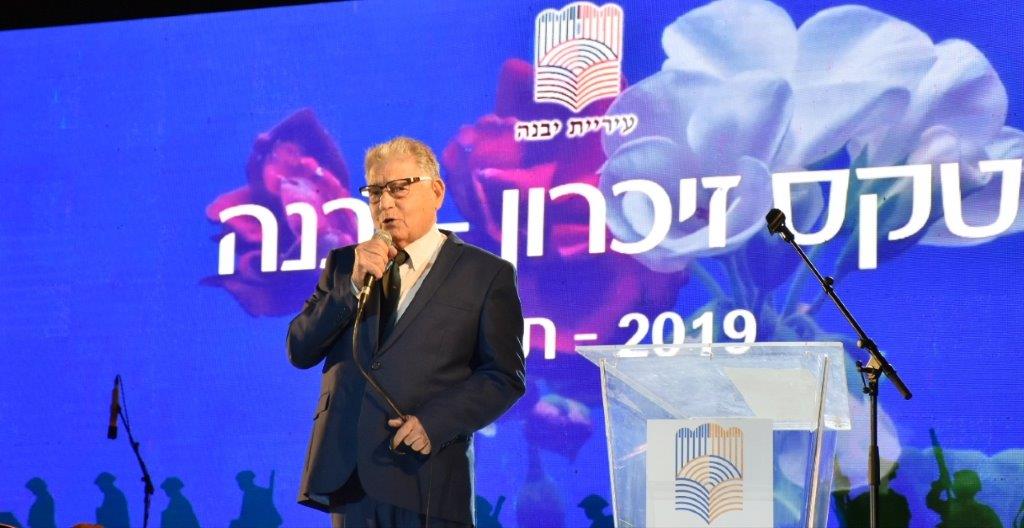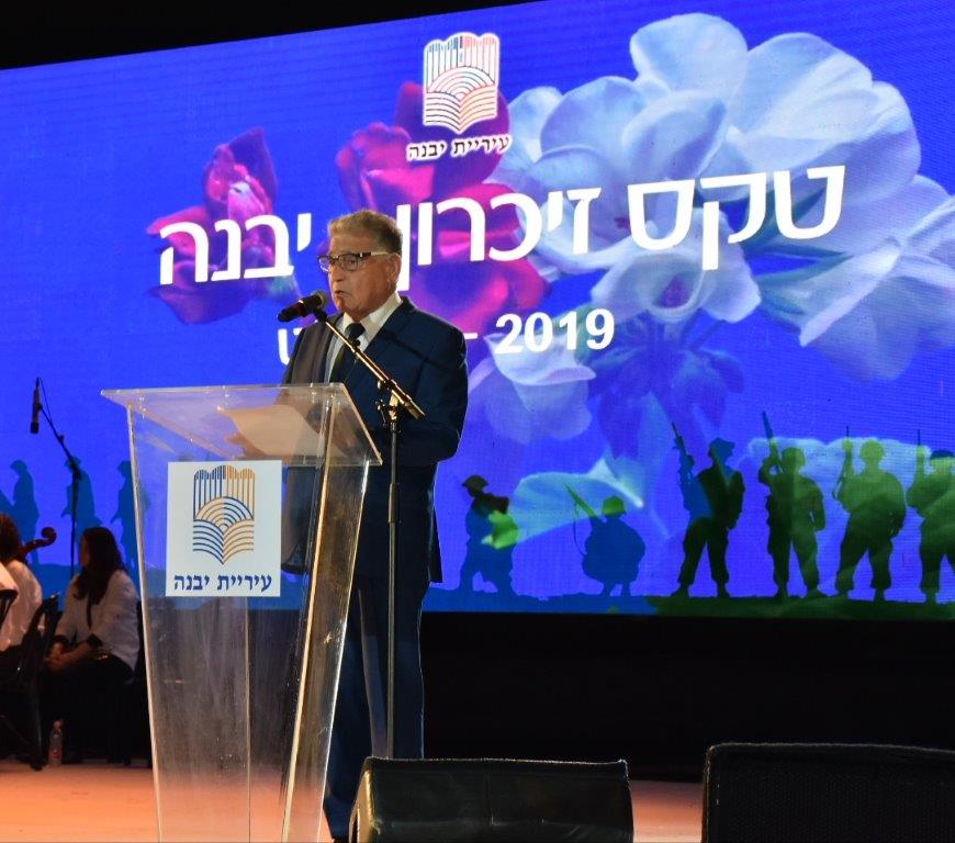 ראש העיר, צבי גוב-ארי אמר בטקס כי "אין אומה בעולם הנלחמת על זכותה להתקיים עשרות בשנים ולא חדלה לשלם מחיר דמים של מיטב בניו ובנותיו להגנה על עצם קיומה, אולם בכל עת מבין התוקפן כי ידם של בני העם הזה תהיה על העליונה וכי רוחו האיתנה ואמונתו בצדקת דרכו יהיו ערובה לקיומו לדורות". גוב-ארי פנה למשפחות השכולות ואמר כי הוא ותושבי יבנה יעמדו תמיד לצידם. "יודע אני כי תהום של צער וכאב נפערה עם הליכתם של הבנים והבנות. אתם אלה החשים בה וניצבים כאובים מול החלל שנותר, גם בהיותנו עמכם יודעים אנו כי בדד תישאו את עומס הכאב, ולוואי ויכולתי ליטול קבין מיגונכם ובכך להקל עליכם. אנו תושבי יבנה נוכל רק להחזיקכם קרוב ללבנו ולנחמכם כי קורבן יקירכם התווה הדרך לקיומנו כעם חופשי בארצו. מצווה עלינו לעשות למען היות ראויים לקורבנם, העיר עושה למען חינוך הדור הבא על ערכי ההתנדבות, הנתינה ואהבת הארץ".