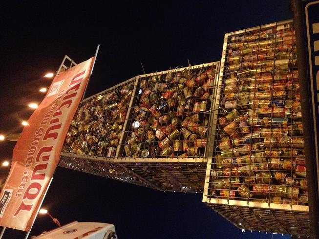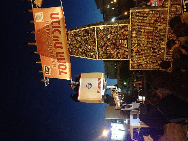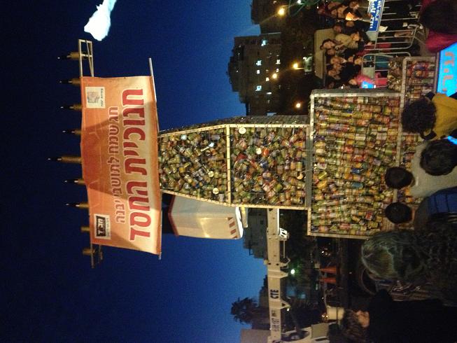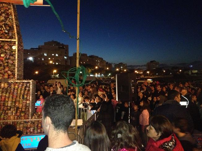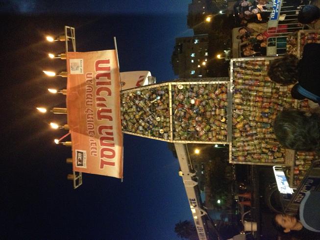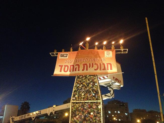 מדליקים את ''חנוכיית החסד'' בגובה חמישה מטרים הבנויה מאלפי קופסאות שימורים