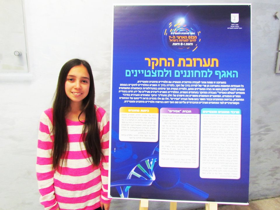 עפרי פרידמן תלמידת כתה ז' גינסבורג האורן, הלומדת במרכז המחוננים ביבנה, נבחרה להציג את עבודת החקר שלה במסגרת תערוכת הפוסטרים המדעיים בכנס השביעי למצוינות של האגף למחוננים ומצטיינים- משרד החינוך.
