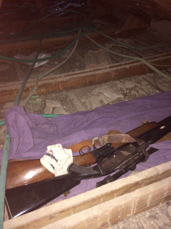 לאחר שהצוות הגיע לגג המבנה, זיהו השוטרים סדינים המכסים חפצים כלשהם בפינת עליית הגג. כאשר הורמו הסדינים התגלו הרובים. בעליית הגג נמצאו שני רובי ציד מסוגים שונים, שרשיר עם 15 כדורים מתאימים ובנוסף גרב ובתוכה עוד חמישה כדורים.
