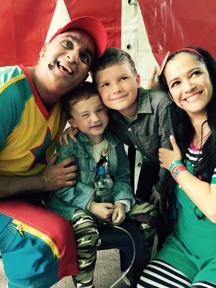 בתמונה: רומן (מחובר לבלון חמצן) מבלה עם אחיו בהצגה של יובל המבולבל ומיקי .