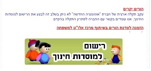 עקב תקלה ארצית של חברת אוטומציה החדשה לא ניתן בשלב זה לבצע את הרישום למוסדות החינוך. החברה המספקת את שירותי הרישום בעשרות יישובים מוסרת כי היא פועלת להתגבר על התקלה בהקדם האפשרי. בתום הטיפול בתקלה נודיעכם על חידוש ההרשמה. עמכם הסליחה".