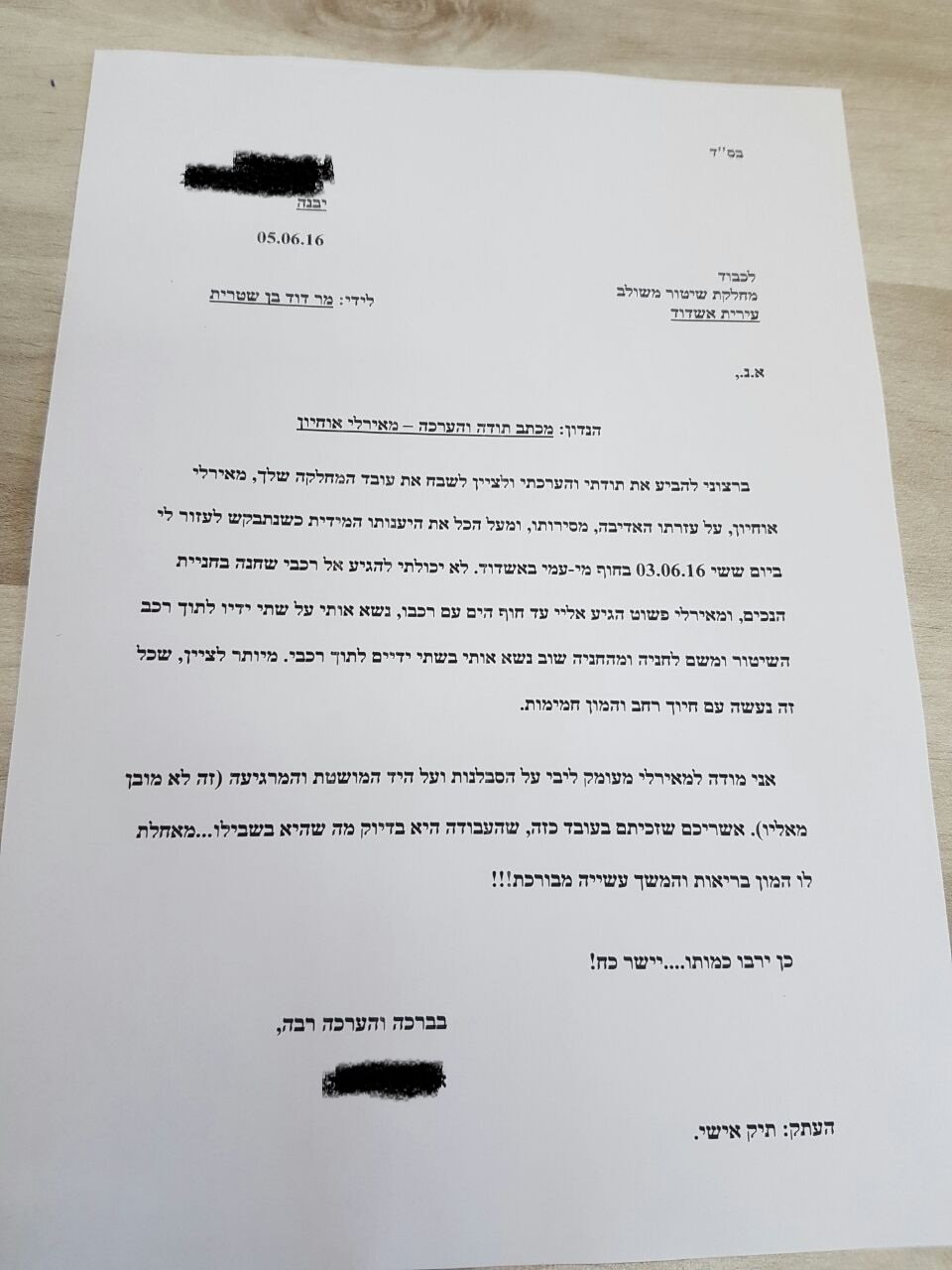 בסוף השבוע האחרון, הגיעה תושבת יבנה, לחוף הים באשדוד וכיוון שסובלת ממגבלה פיזית, לא הצליחה להגיע בחזרה אל רכבה בחניית החוף. השוטר העירוני מאירלי אוחיון עבר בסמוך לאישה שביקשה ממנו עזרה, מאיר לי לא חשב פעמיים וסייע לה בצורה מרגשת כפי שכתבה תושבת יבנה במכתב התודה ששלחה לעיריית אשדוד.