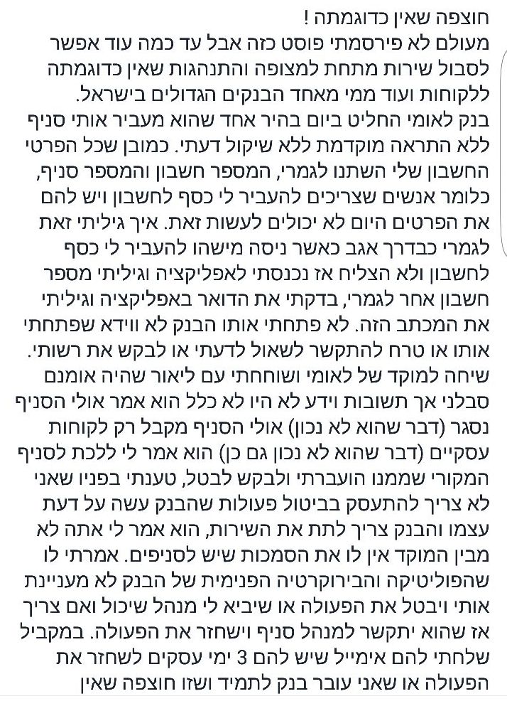 פוסט שפורסם בפייסבוק על ידי לקוח של הבנק בעקבות המעבר ללא הודעה מוקדמת: