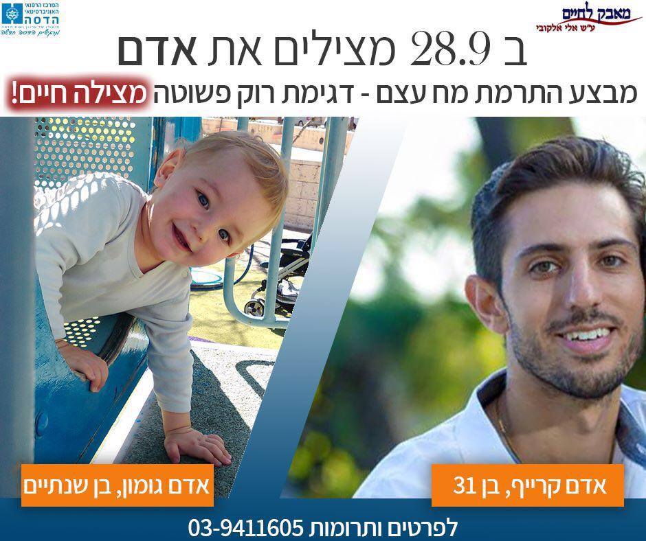 תושבי יבנה מתאחדים כדי להציל את חייהם של אדם קרייף בן ה- 31 ואדם גומון בן השנתיים הזקוקים לתרומת מח עצם