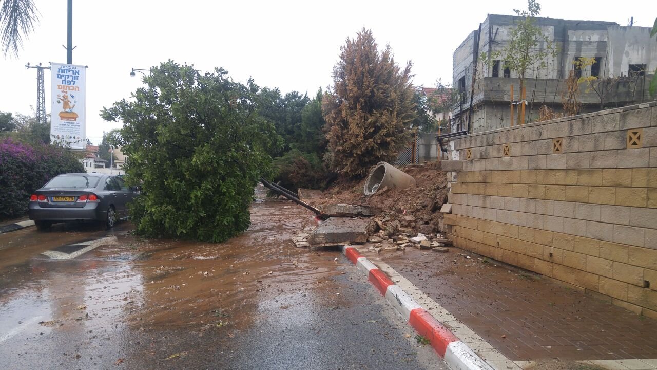 נזק ראשון ומשמעותי עקב הגשמים והרוחות. לפני דקות אחדות קרסו חומה ועץ הנמצאים בסמוך לבית שנמצא בשלבי בניה ברחוב הראשונים אל המדרכה והכביש ובעקבות כך נחסם הכביש לתנועה. בדקות אלו פועלים צוותים מטעם העירייה במקום