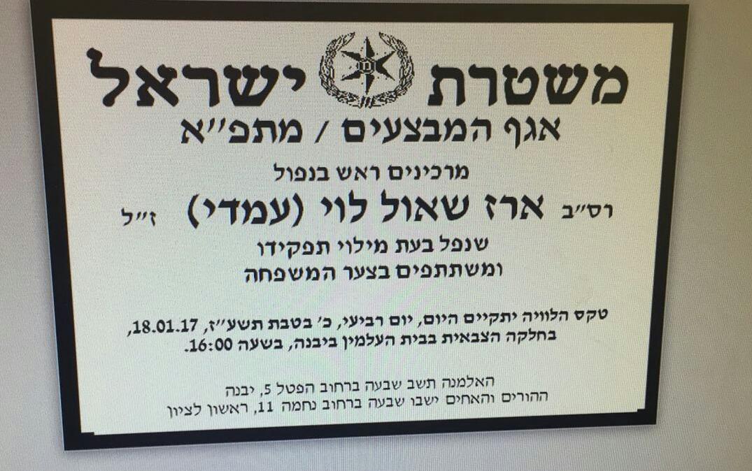 רס"ב ארז לוי ז"ל, שנרצח לפנות בוקר בפיגוע הדריסה בנגב יובא למנוחות היום בשעה 16:00 בבית העלמין ביבנה. אלמנתו תשב שבעה בביתם שברחוב הפטל 5 בעיר. ההורים והאחים ישבו שבעה ברחוב נחמה 11 בראשל"צ