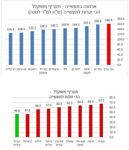 בקרב 10 הערים הזולות ביותר בישראל לעסקים מבחינת תשלומי הארנונה נמצא רוב בולט של ערים עם אוכלוסייה ערבית – העיר הזולה ביותר היא אום אל פחם, שבה הארנונה השנתית בתחום השירותים והמסחר עומדת על 64.2 שקל למ״ר כ-65% פחות מהממוצע הארצי. חיפה מדורגת אחריה עם 66.4 שקל למ״ר, ולאחריה מודיעין עילית עם 70 שקל למ״ר לשנה. עוד בדירוג הערים הזולות ביותר – טירה, נצרת, יבנה, ביתר עילית, עכו, חדרה ונצרת עילית.