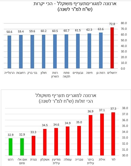 הערים הזולות ביותר לארנונה למגורים בישראל הינן רהט ואום אל פחם, הגובות 32.9 שקל למ״ר לשנה. ואילו בנצרת התעריף עומד על 33.3 שקל למ״ר לשנה. באשקלון הארנונה למגורים עומדת על 34.5 שקל למ״ר בדומה למודיעין עילית ועפולה. עוד בדירוג הזולות – טבריה, ביתר עילית, אילת ולוד.