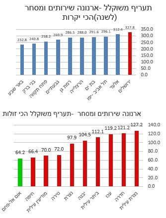 העיר הגובה את הארנונה הגבוהה ביותר בתחום השירותים והמסחר היא ירושלים, שם התעריף עומד על 327.8 שקל למ״ר לשנה, פי 5 מהארנונה בחיפה העומדת על 66.4 שקל למ״ר לשנה. לשם השוואה, ממוצע התעריף של ארנונה למסחר ושירותים בערים השונות בישראל עומד על 184.3 שקל למ״ר לשנה, כך שירושלים גובה תעריף הגבוה ב-78% מהממוצע בישראל.