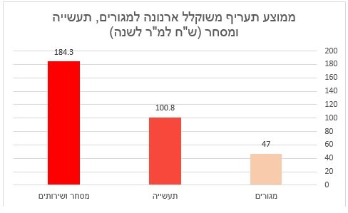 בעוד שתעריף הארנונה למגורים השנתי הממוצע של העיריות בישראל ממגורים עומד על 47 שקלים למ״ר בלבד, תעריף הארנונה למסחר ושירותים עומד על 184.3 שקל למ״ר – כמעט פי 4. הארנונה הממוצעת לתעשייה עומדת על כ-101 שקלים למ״ר לשנה.
