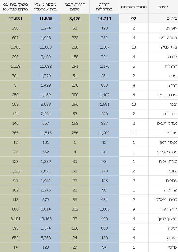 היישובים אליהם נרשמו המשפחות הרבות ביותר לפי סדר יורד: ראשון לציון (13,163), הרצליה (11,692), מודיעין (11,515), בית שמש (11,063), ויבנה (8,088) מתוכם 503 בני המקום!