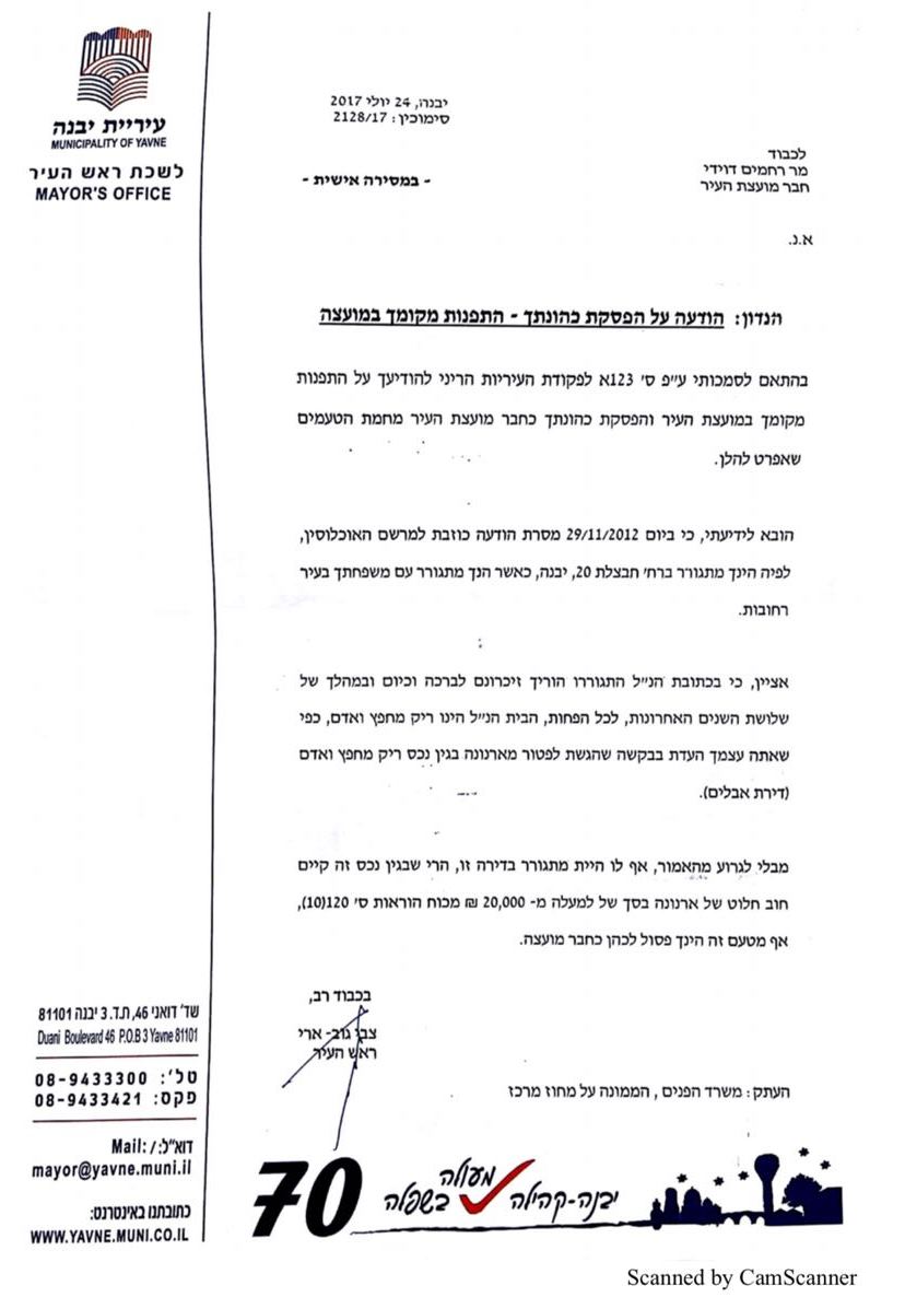 "בהתאם לסמכותי על פי סעיף 123 א' לפקודת העיריות הריני להודיעך על התפנות מקומך במועצת העיר והפסקת כהונתך כחבר מועצת העיר" כתב גוב ארי במכתב שהעתק ממנו נשלח גם לממונה על מחוז מרכז במשרד הפנים.