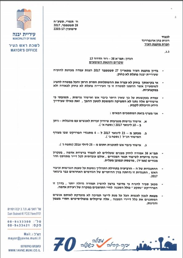 במכתבו לארנפרוינד כותב גוב-ארי כי "בדיון מועצת העיר מתאריך 27 ספטמבר 2017 הצגת עמדה מכוונת להוכיח שעיריית יבנה פועלת לא כחוק. אי-בקיאותך בחוק לא עצרה את ההשתלחות חסרת הרסן והכל במטרה להציג לשומעייך, אשר הוזמנו למטרה זו, כי העירייה פועלת לא כחוק לכאורה ולא במקצועיות. עמדת בעקשנות על כך שאין היתר כיבוי אש ואישור נגישות, תשובתי כי אישורים אלה ניתנו לא הספיקה והמשכת לטעון ההפך, זאת כאילו שבידייך הידע והיכולת לקבוע".