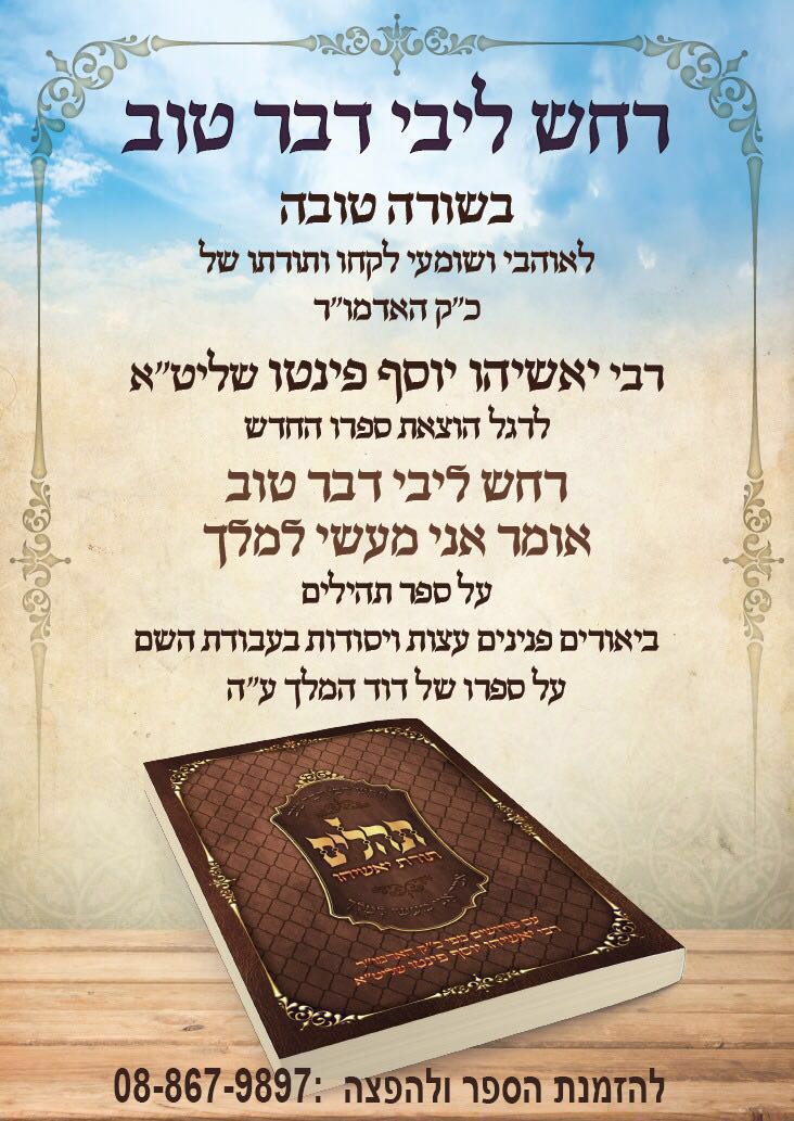 בשורה טובה לאוהבי ושומעי לקחו ותורתו של כבוד קדושת האדמו"ר הצדיק רבי יאשיהו יוסף פינטו שליט"א לרגל הוצאת ספרו החדש "רחש ליבי דבר טוב אומר אני מעשי למלך" פירוש על ספר התהילים ביאורים פנינים עצות ויסודות בעבודת ה' על ספרו של דוד המלך ע"ה.