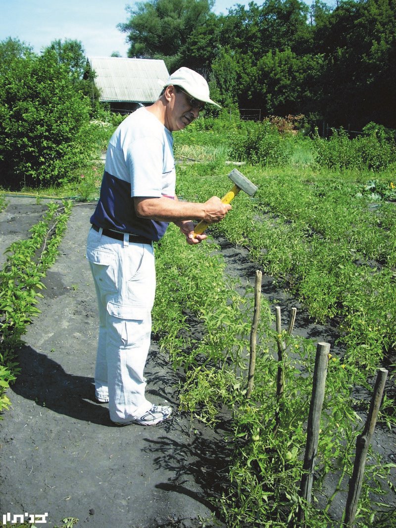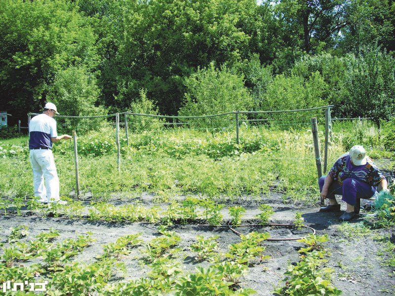 לבשנו בגדים ונעליים מתאימים וירדנו למטה לחלקת הגידולים הצמודה. הראו לנו את המבנים- מתקנים הנפרדים מהבית. כך בקתת השירותים בשיטת "בול-קליעה", כך המחסן וכך המטבח שבסמוך לו "שולחן האוכל" מתחת לעץ ערבה גדול ואדיר, שם אכלנו את ארוחותינו לקול ציוץ הציפורים ולמשב האוויר המרענן של הרוח הנעימה. העבודות היו שונות ומגוונות. כך למשל, תקענו מוטות ומתחנו חוטים וחבלים להרמת ענפי הגפנים, כך קטיף התותים והחמוציות, כך גיזום השיחים או עקירת עשבים, וכך השקיית הכרובית, הקישואים, המלפפונים, האבטיחים, הבצלים והשומים.