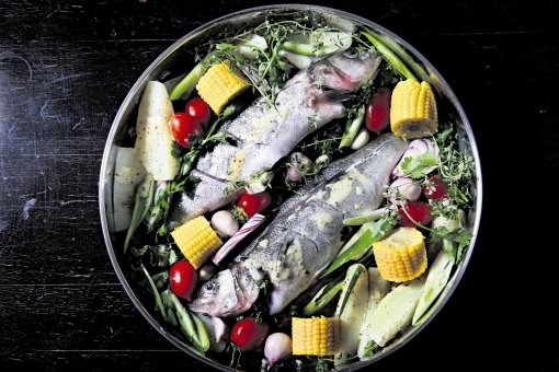 אפשר גם: אני לרוב משחק עם תבנית הדגים בצמוד למה שהעונה מציעה וכך מתקבלת תבנית של הפתעות. הפעם בחרתי להוסיף תירס טרי, שעכשיו הוא צעיר ורך. אפשר כמובן לנצל רגעים אחרונים של שומר או כל ירק שאוהבים. אפשר גם להוסיף פרוסות לימון ללא הקליפה ולפזר שיני שום בשלמותן.
