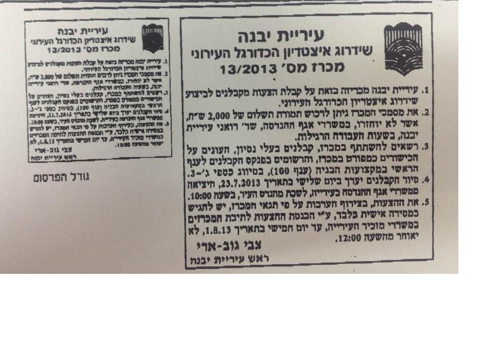ביום חמישי, פרסמה עיריית יבנה מכרז מס' 13/2013 שכותרתו "שדרוג אצטדיון הכדורגל העירוני".