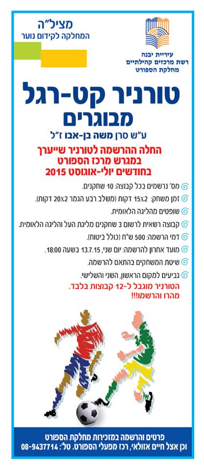 לאחר שבשנה שעברה לא נערך הטורניר המסורתי לזכרו של סרן משה בן-אבו ז"ל בגלל מבצע 'צוק איתן', ישובו הקיץ שחקני הקט-רגל למגרש. טורניר הקט-רגל למבוגרים נערך ביוזמת המחלקה לספורט בעיריית יבנה משנת 1987 ונקרא ע"ש סרן בן-אבו ז"ל, תושב העיר, שנפל בעת מילוי תפקידו. הטורניר בהשתתפות 12 קבוצות יחל ביום רביעי 22.7 במגרש הקט-רגל ברחוב האלון בסיומו תוכתר אלופת יבנה בקט-רגל.