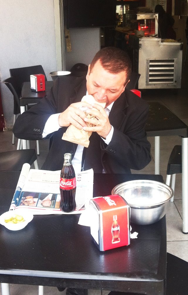 המועמד לראשות העירייה עו"ד שמעון עשור נראה נוגס בהנאה לאפה עמוסה שאוורמה ועושה אתנחתא מהפוליטיקה ומבתי המשפט. פורטונה אומרת לבריאות ובתיאבון