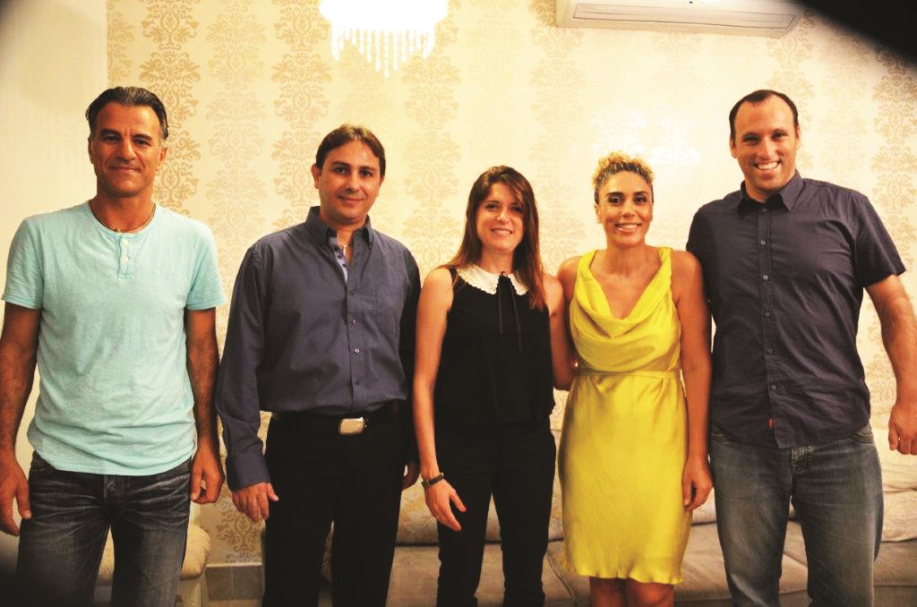 מימין: יגאל ברנד, רות איטח, קרנית גולדווסר, מאיר דהן ומשה איטח בערב ההרצאה של קרנית בבית משפחת איטח. לפורטונה נמסר שהיה מרתק ומרגש (צילום: דוד מטודי)