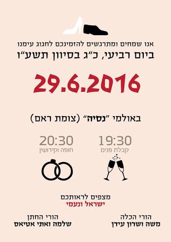 אם אתם חושבים שאתם צפויים לקבל הזמנה לחתונה של ישראל אטיאס אז שתדעו שזה אמור להיות ממש בקרוב. אטיאס ובת זוגו נעמי עידן שחררו לעולם את ההזמנה הרשמית לחתונה, הזמנה מצוירת ומגניבה שמראה כי החתונה תתקיים ב29/6 באולמי "נסיה" . כמובן שמעבר לכמות הסלבס הגדולה שצפויה להיות בחתונה, לא מעט יבנאים אמורים להעלות סלפים ברגעי האמת מהחופה והריקודים. אנחנו מצפים בשקיקה